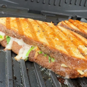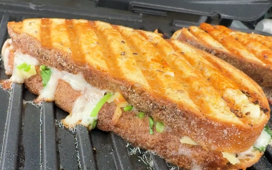 • Place the top piece of bread on the finished layers, and place it on the panini grill, and press down. Grill until the bread is browned and the cheese is melty.