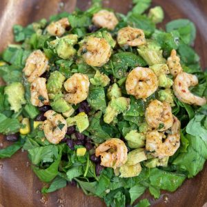 - Depending on how you are plating or serving the salad, the avocado and shrimp will be added to the top of the salad. If plating, add the fresh ingredients to the plate, then sprinkle the avocado around the top, followed by evenly placing the shrimp.