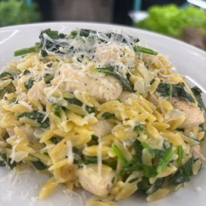 - Once the orzo is cooked and liquid has been absorbed, add in chopped spinach and parm. Stir until combined and spinach is wilted.