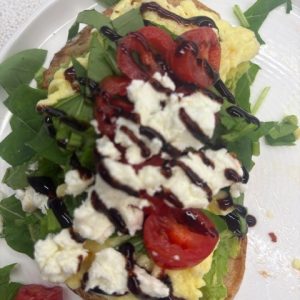 - Sprinkle the arugula over the eggs, place grape tomatoes around, and dollop the goat cheese on top.