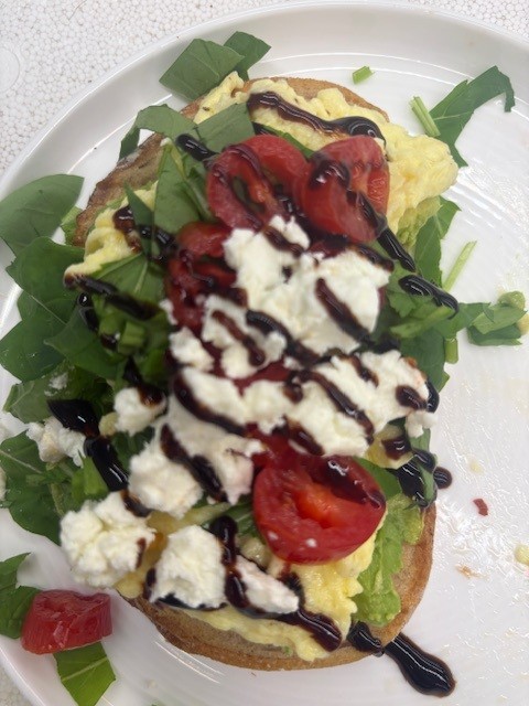 - Once the eggs are cooked, begin to build the open-faced breakfast toast.